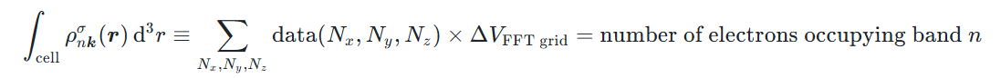 因此,对于电荷密度输出的 cube 格式文件,其 FFT 格点上数值的单位为 1/Bohr³。值得注意的是,电荷密度积分后的电子数目应该是守恒的,即在晶胞内对电子密度积分应等于该能带上占据的电子数目: