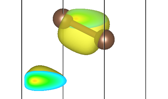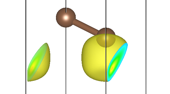 然而,能带分解电荷密度(band-decomposed charge density,有时又称为 partial charge density)则是不论某能带是否占据,都把该能带单独拿出来,计算相应的电荷密度,并且不同自旋、不同 k 点都要求可以单独计算和绘制,也就是这样一个: