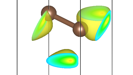 例如,第一条能带 Γ 点自旋向上的贡献存储在 BAND1_K1_SPIN1_CHG.cube 文件里,可视化效果为: