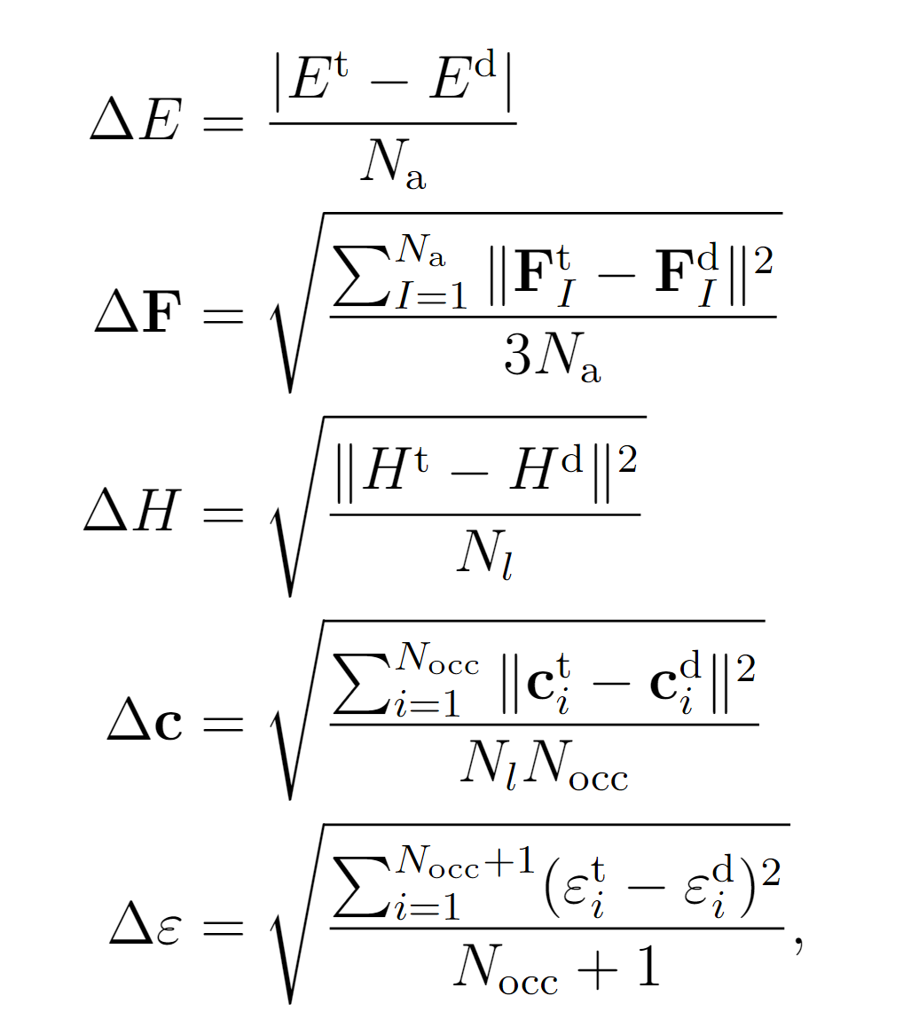 其中包含五项,表达式表示的每个元素的平方和。参数分别是能量、原子力、哈密顿矩阵、波函数系数和能级的权重因子。上标和分别代表目标泛函和 DeePKS-ES 模型的结果。第一项是能量项,定义为每个原子的平均能量与目标能量的差值,其中$N_a$是系统中的原子数。第二项涉及原子受力,计算每个原子在三个方向上的力差值。