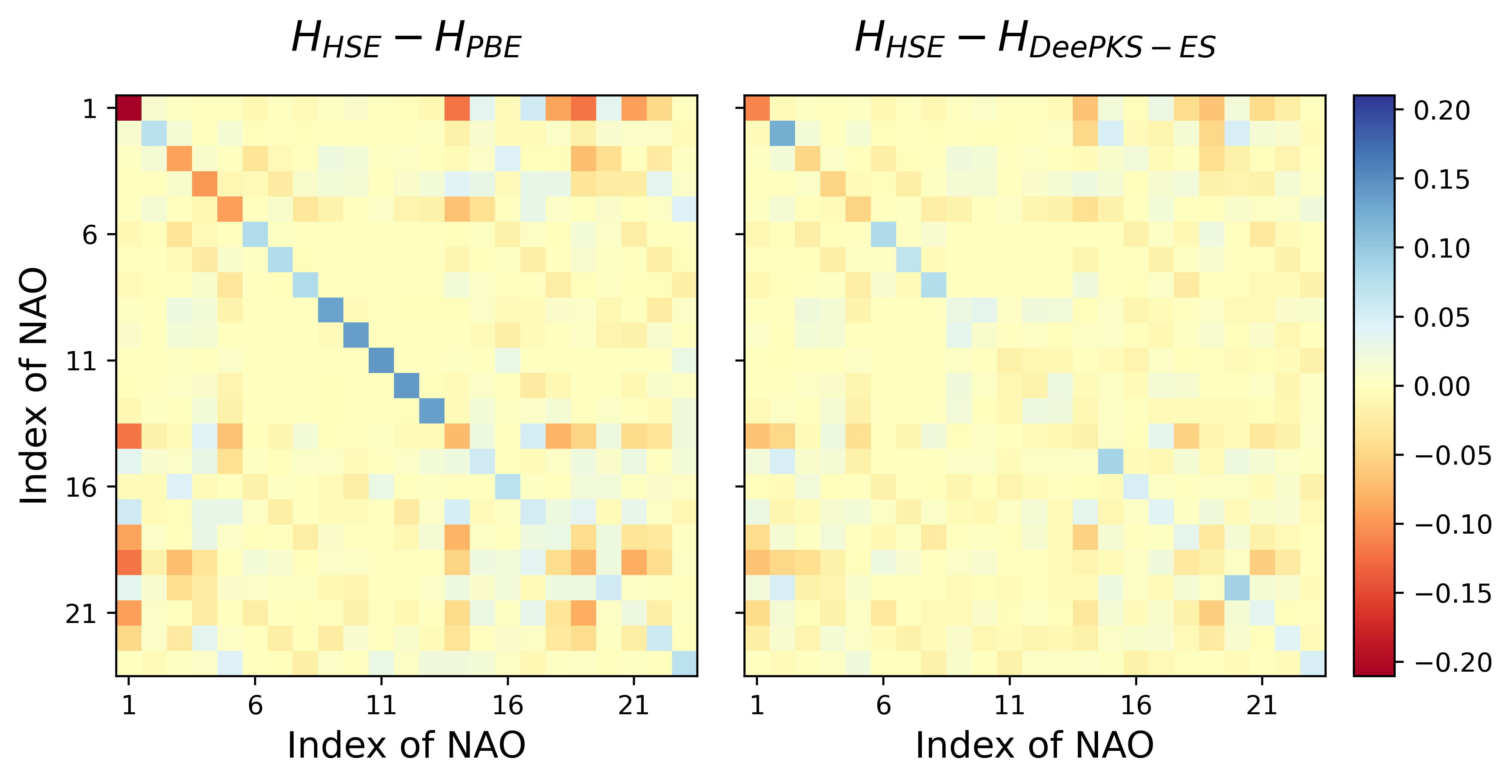 进行 SCF 计算后可以发现,PBE 与 HSE 的总能量差别为 0.08 eV,而 DeePKS-ES 与 HSE 的总能量差别下降到了 0.01 eV。对于哈密顿量矩阵差别,可以运行 03_evaluate/02_hamiltonian/cal_diff_H_total.sh 文件,得到 diff_H_total.png 如下。左右两图分别表示 HSE 与 PBE/DeePKS-ES 的哈密顿量差别,可以看到 DeePKS-ES 的哈密顿量相比于 PBE 而言有所改进。