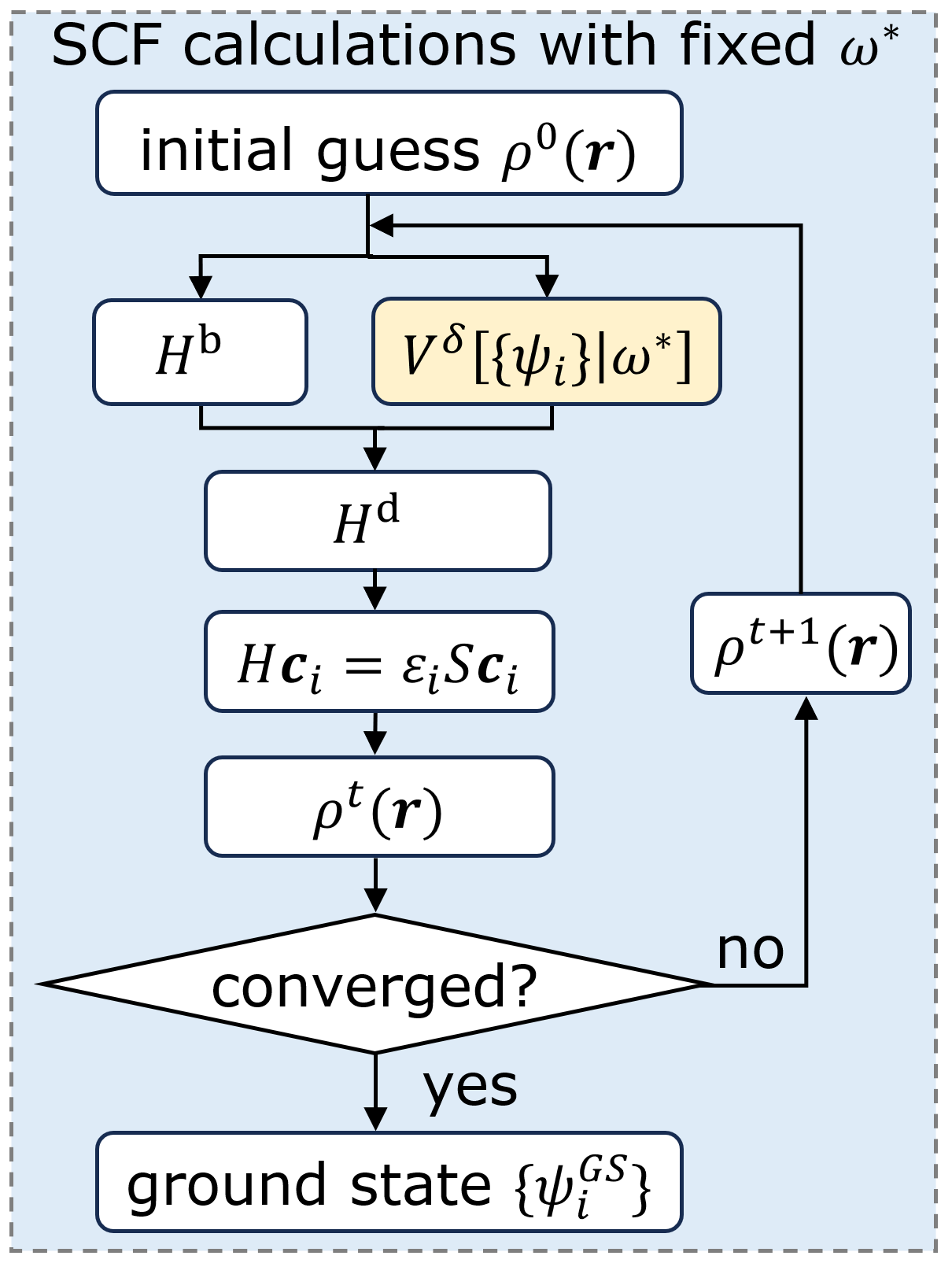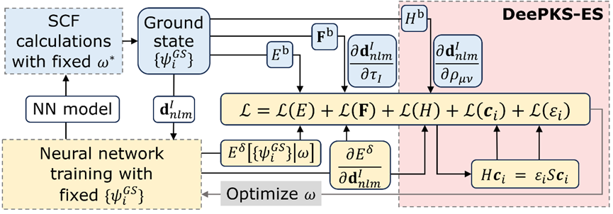 DeePKS-ES 的计算流程图如下所示,其中蓝色、黄色背景的内容分别表示迭代训练中的 SCF 和训练步骤。红色方框表示 DeePKS-ES 与 DeePKS 的区别。