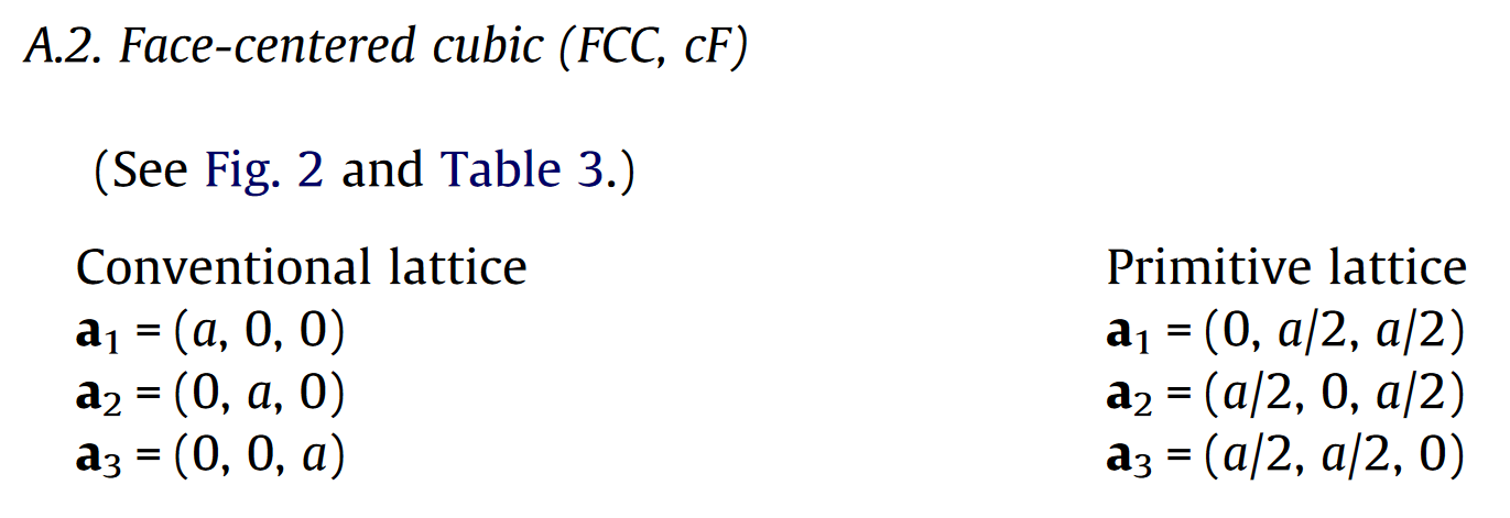 这是一个标准的 fcc 单胞结构,但是我们做 DOS 和电子能带结构计算时,常用原胞,因此需要做一步结构转换,转换公式如下图所示: