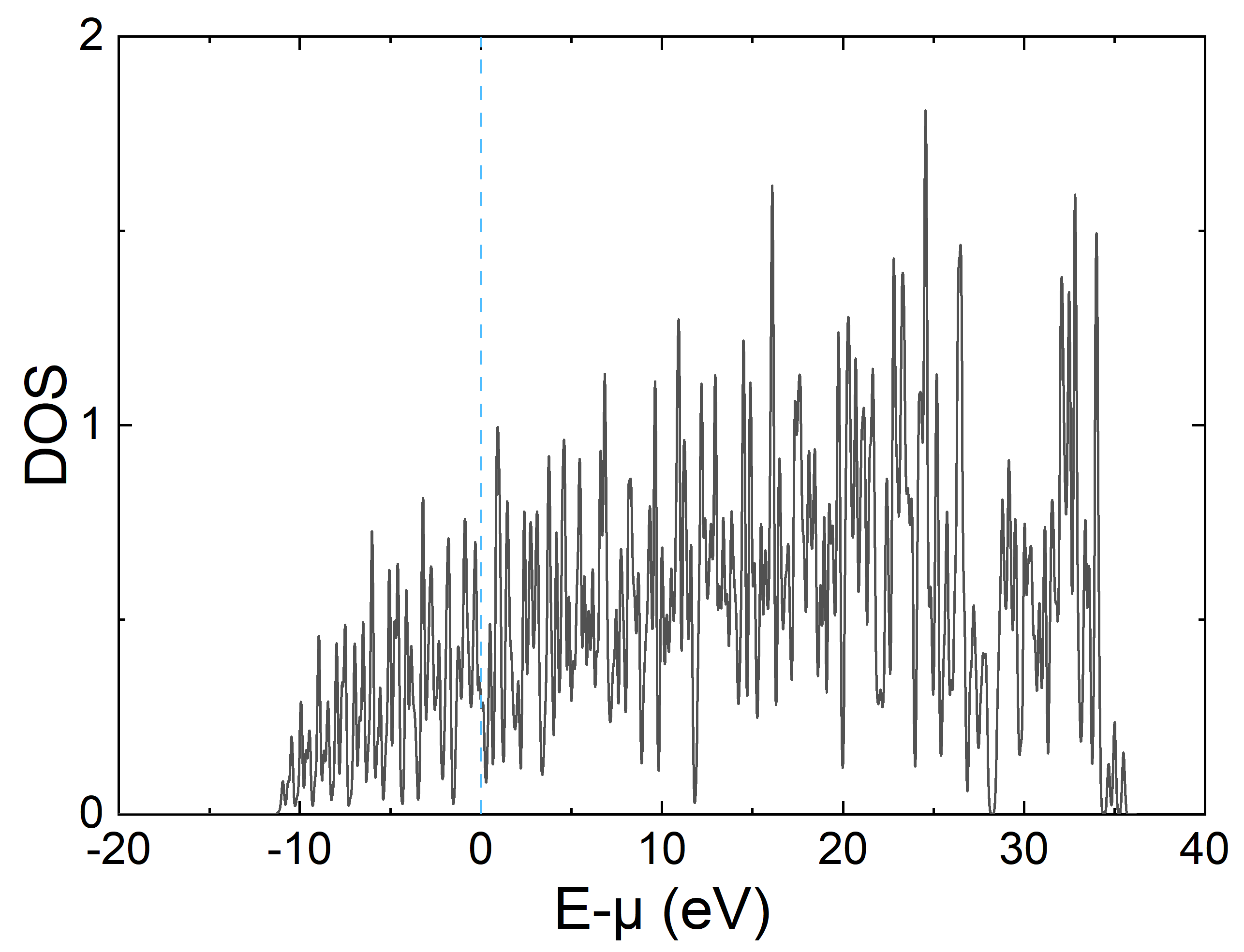 下面是使用 Origin 绘制的态密度图,出现很多毛刺的原因是为了减少计算量 K 点取得较少,可以通过展宽方法做得更平滑(dos_sigma,默认值为0.07),实际计算也可根据需要增大非自洽计算的 K 点网格