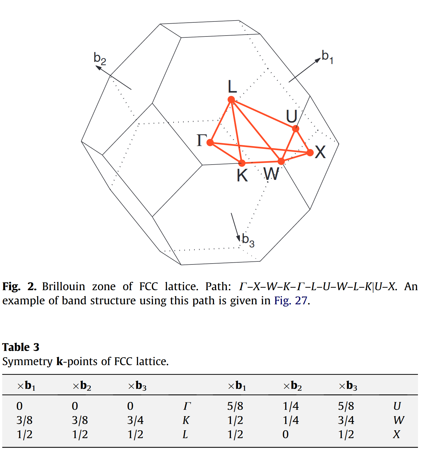 对于 fcc 的原胞,它的高对称点和可选的路径如下图 [1] 所示: