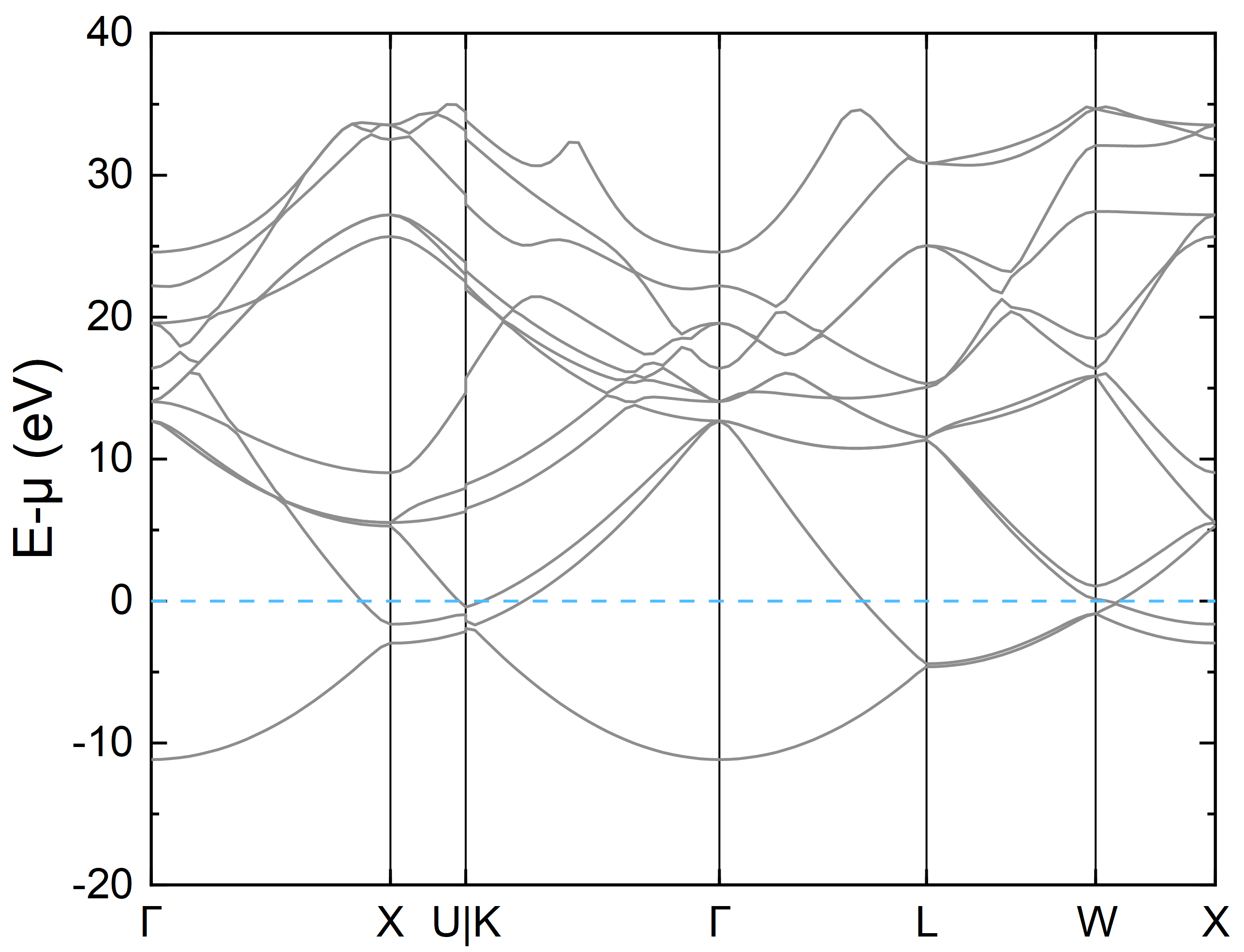 下面是绘制的能带图,图中有不够光滑连线的原因是为了减少计算量,K 点取得较少,实际计算可根据需要增多 K 点间采点数目