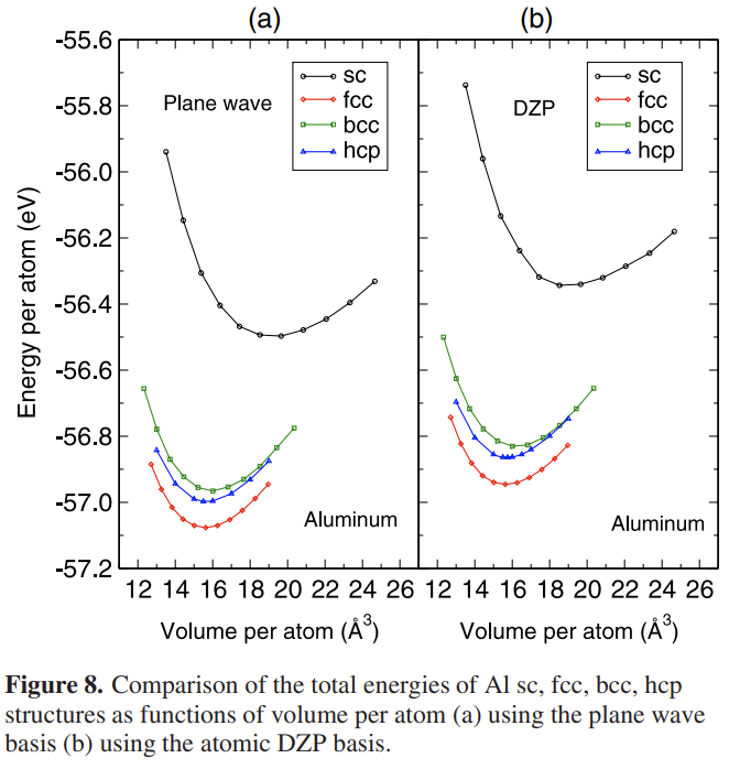以 Al 元素为例,我们可以选择 simple cubic(sc),body center cubic(bcc),face center cubic(fcc)和 hexagonal close-packed(hcp)这 4 种常见的晶体结构,采用平面波(Plane wave)基组和数值原子轨道基组计算这些晶体结构的平衡晶格常数、体弹性模量等基态性质,评估两种基组之间的误差随着截断半径、最大角动量以及轨道数量的收敛趋势,选择合适的数值原子轨道文件。例如以下就是用 ABACUS 的平面波和数值原子轨道 DZP 计算的铝的四种体相材料的体积-能量曲线,来自文献[1]。从图中可以看到,DZP 轨道描述不同体相的铝的相对能量还是精度较高的。细心的读者会发现纵坐标给出的是绝对能量,因为两种基矢量采用了相同的赝势,但左图给出的能量更低,这是因为平面波更加完备,所以根据 Honhenberg-Kohn 定理,体系总能量的密度泛函可以在更完备的基矢量下得到更好的收敛,即总能量更低。一般来说,平面波得到的总能量比 DZP 轨道小一些,大概在 0.1-0.2 eV/atom,是比较合理的。如果采用了同样的赝势,但两种基矢量给出的能量差别远远大于这个数值,则要检查一下是不是数值原子轨道产生出了问题。最后,大家有任何问题,欢迎写邮件到文档开头邮箱。
