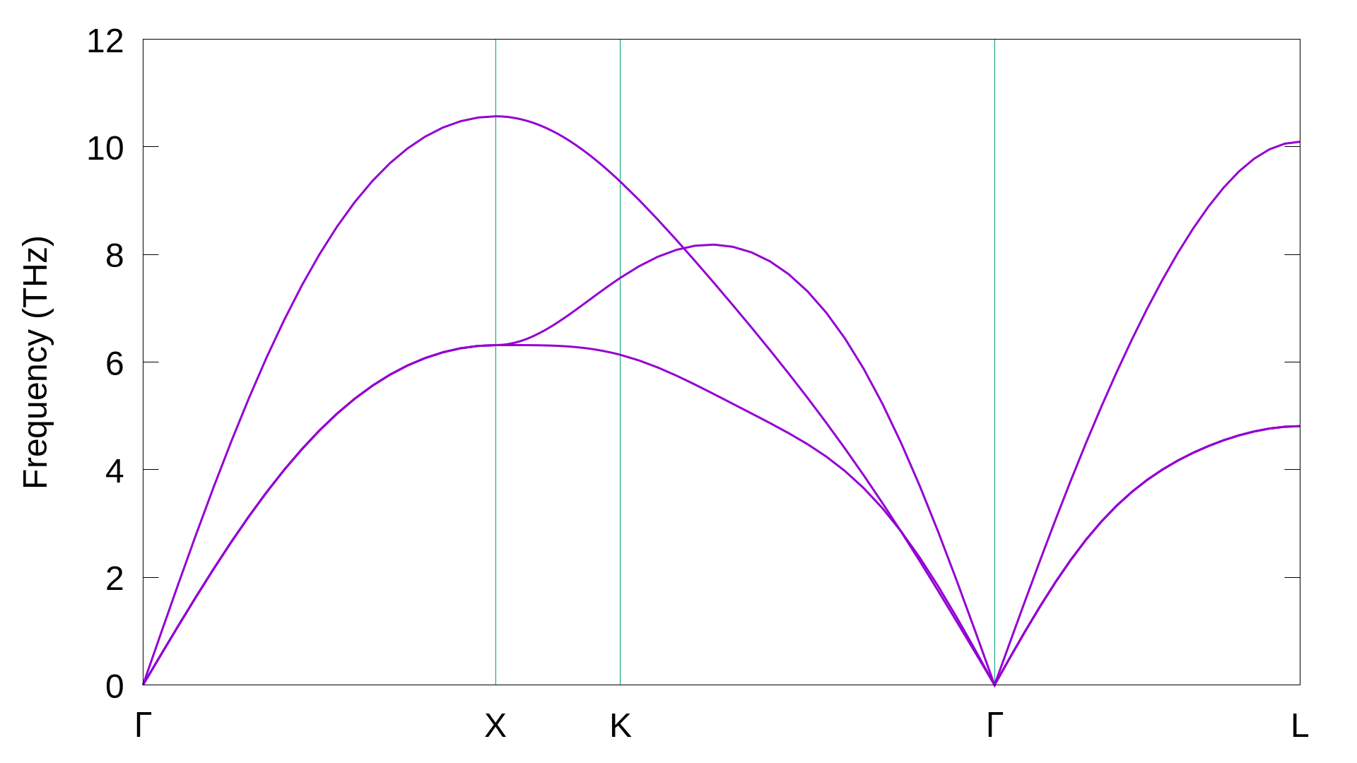 也可使用 Origin 绘图,pho.dat 的第一列就是上图的横轴(K 点路径),其中高对称 K 点位置见 pho.dat 的第二行,第二列就是上图的纵轴(声子频率,单位 THz)。