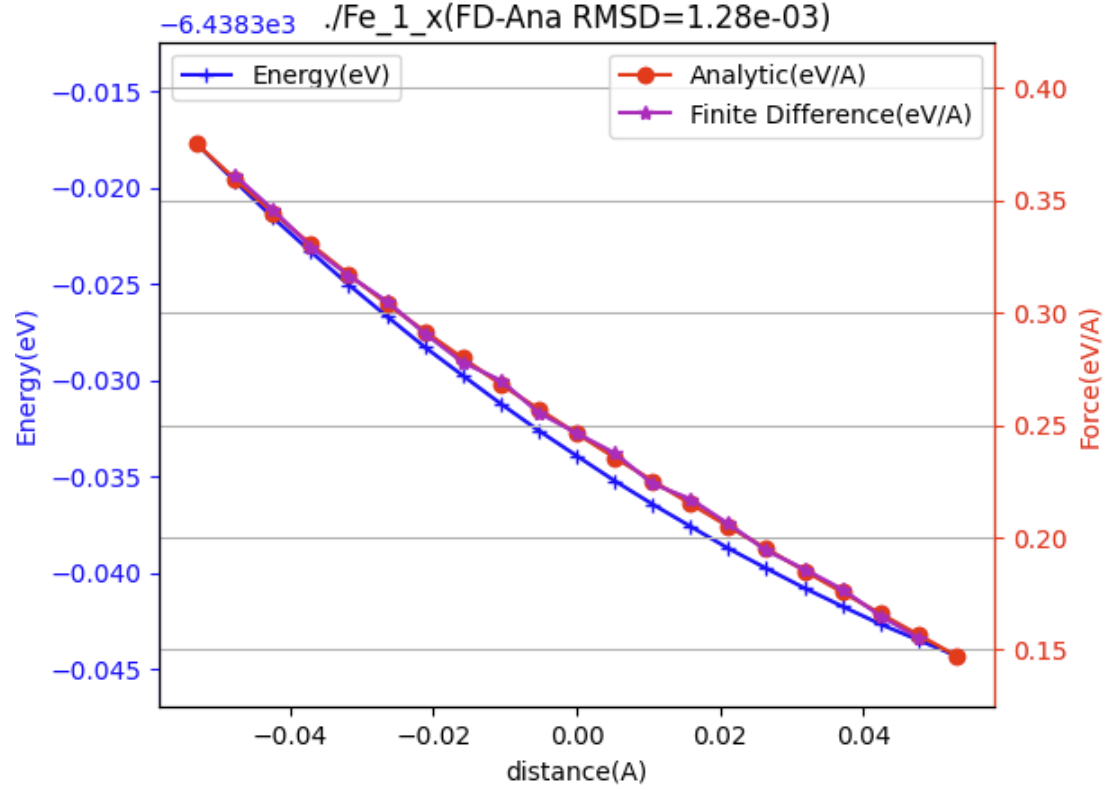 图. 对第一个 Fe 原子的 x 方向的差分测试结果。图最上方的 FD-Ana RMSD 是差分值和解析值得均方差。此算例表明 Fe_1_x force 得解析误差~1.28e-03 eV/A。此测试设置的步长为 0.01,差分点个数为 10(predft_command: python prepare.py -d 0.01 -n 10),任务地址:https://app.bohrium.dp.tech/abacustest?request=GET%3A%2Fapplications%2Fabacustest%2Fjobs%2Fjob-abacustest-v0.3.97-770b66