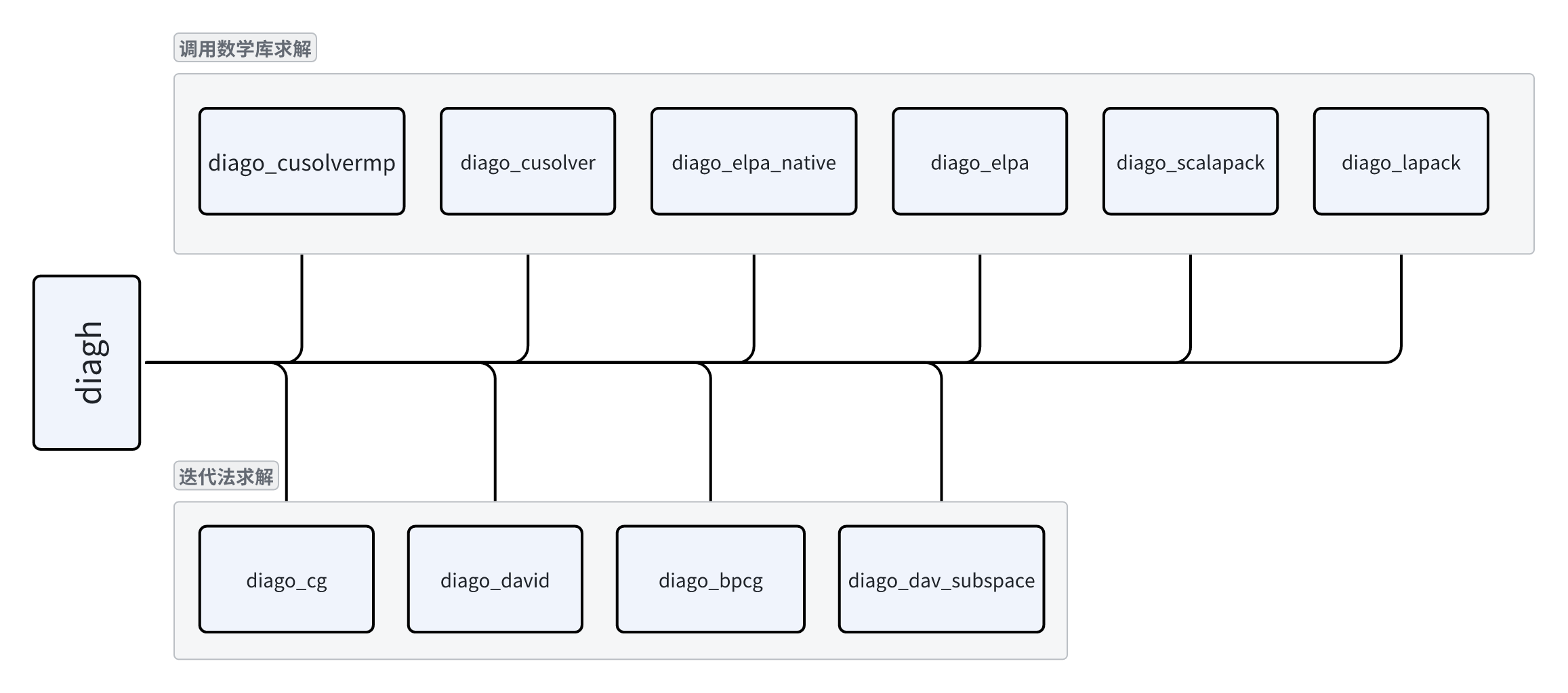• diago_scalapck:基于 scalapck 数学库求解,只能多核并行(仅 CPU)。