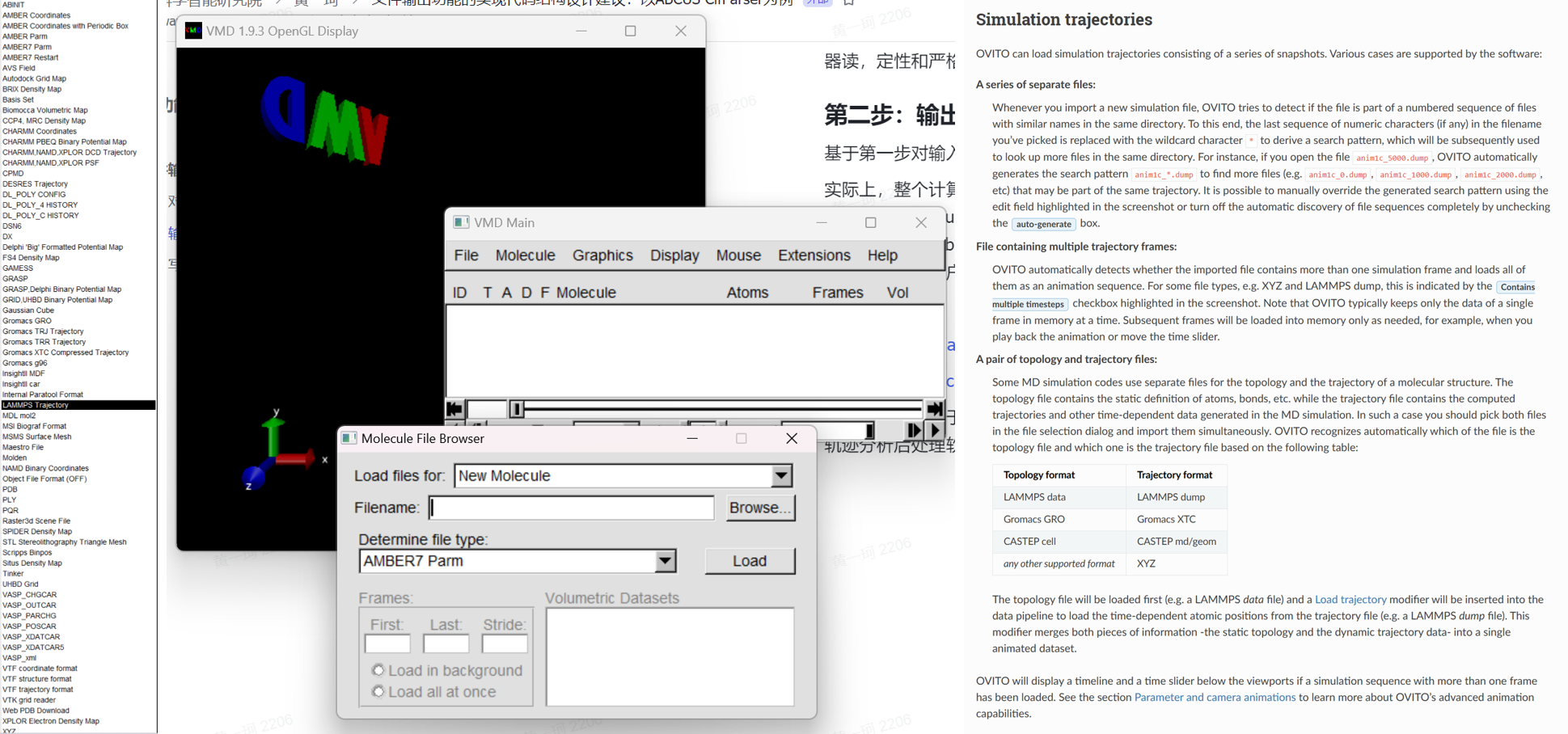 对于 MD 轨迹则应当调研常见的轨迹分析后处理软件和可视化软件的可接受格式,如 Visual Molecular Dynamics (VMD)、OVITO,分别在蛋白模拟、材料模拟领域久负盛名,各自具有庞大的用户群体: