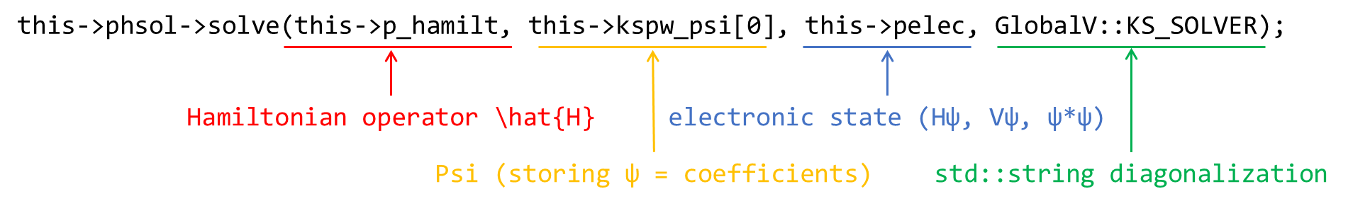 不难发现 phsol(pointer to HSolver)所调用其成员函数 solve() 一定是对角化的主体,HSolver 其顾名思义为 Hamiltonian 矩阵的求解器。针对具体的软件编写,我们关心在对角化过程中,究竟需要哪些(哪类)变量。最小地,我们对于 general 的对角化问题最统一的预想为仅仅需要 Hamiltonian 矩阵自身,ABACUS 的方案为: