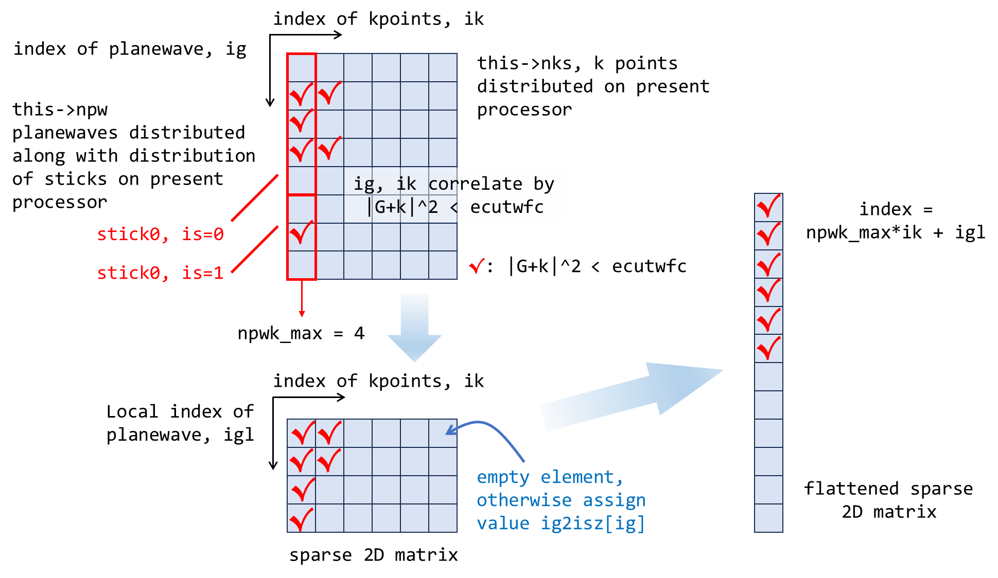 之后使用 PW_Basis_K::initparameters() 函数读取经过 k 点生成、归并、分发后读取的 kvec_c 与 kvec_d、nks 等参数。这三个两存储在 ESolver_FP 对象的 K_Vectors kv 数据成员中:
