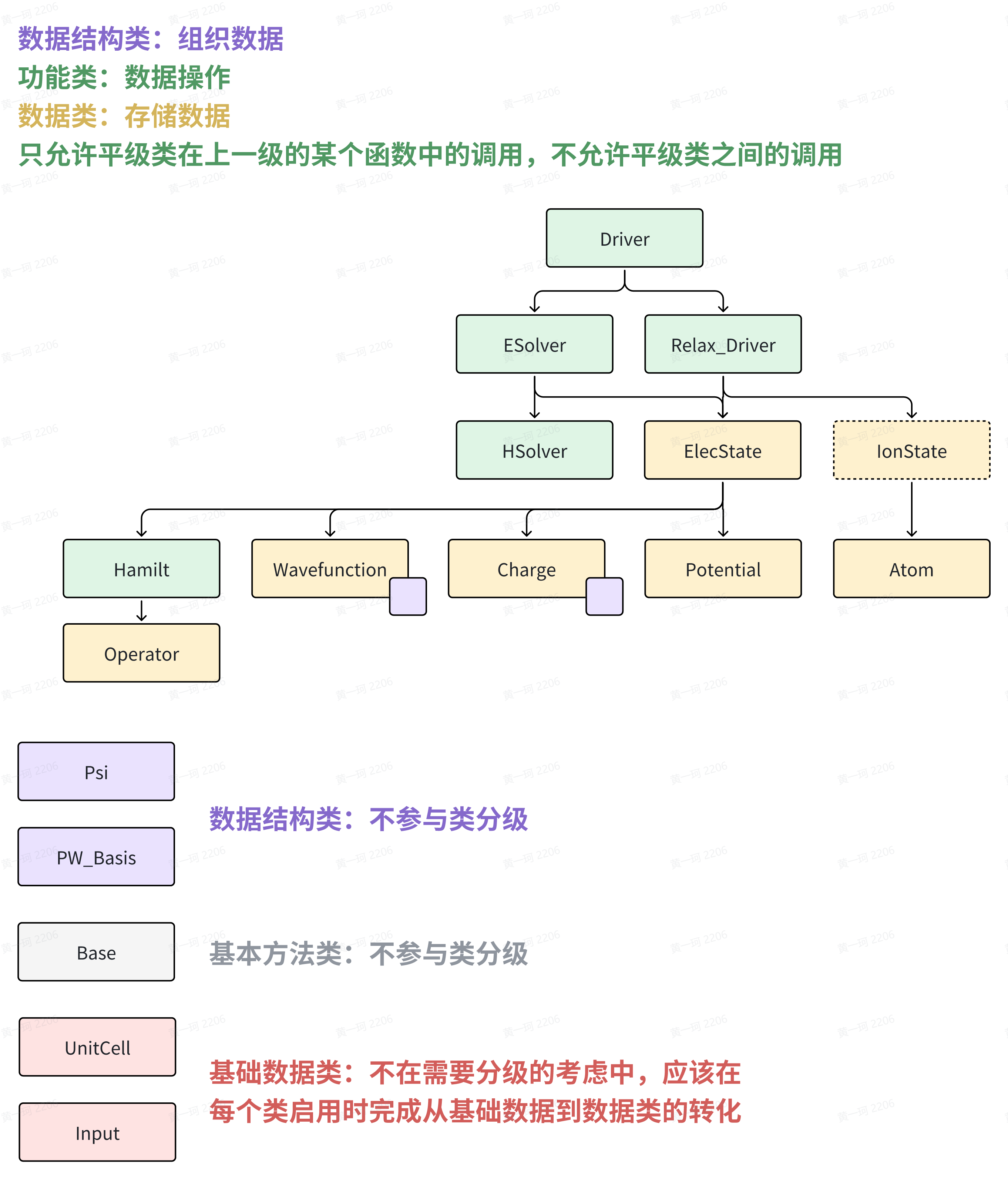 在实际编程过程中,除了将类进行明确的功能区分外,还可以按照类的实际存储数据类型和函数的功能与密度进行二次划分,例如对于 ESolver 和 Relax_Driver(或 Driver 类),他们本身并不涉及到直接和被模拟体系相关的数据存储,即 ESolver 等类是程序流程控制的实现。