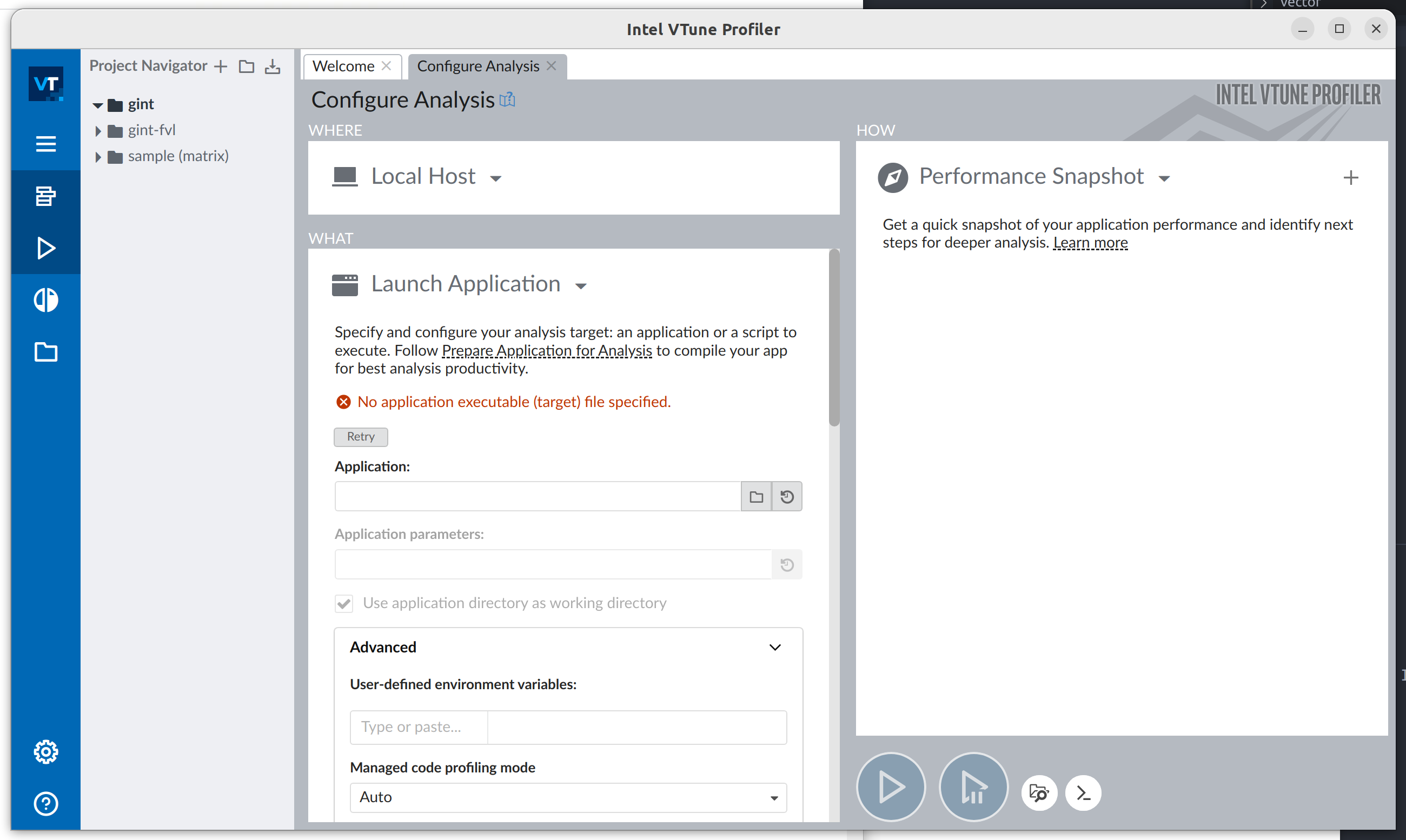 进入 vtune 之后先点击左上角的 Project Navigator 右边的 + 号创建一个 project,比如我打算优化格点积分的 fvl 部分,就可以创建一个 project 命名为 gint_fvl。