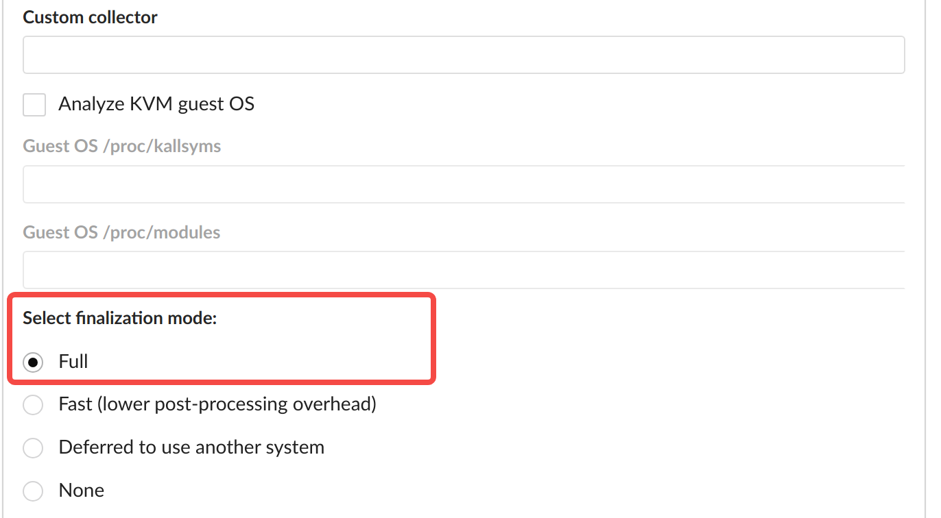 - 在 Advanced 选项里面把”Select finalization mode“设置为”Full“,这里默认设置是”Fast“,默认设置下得不到火焰图