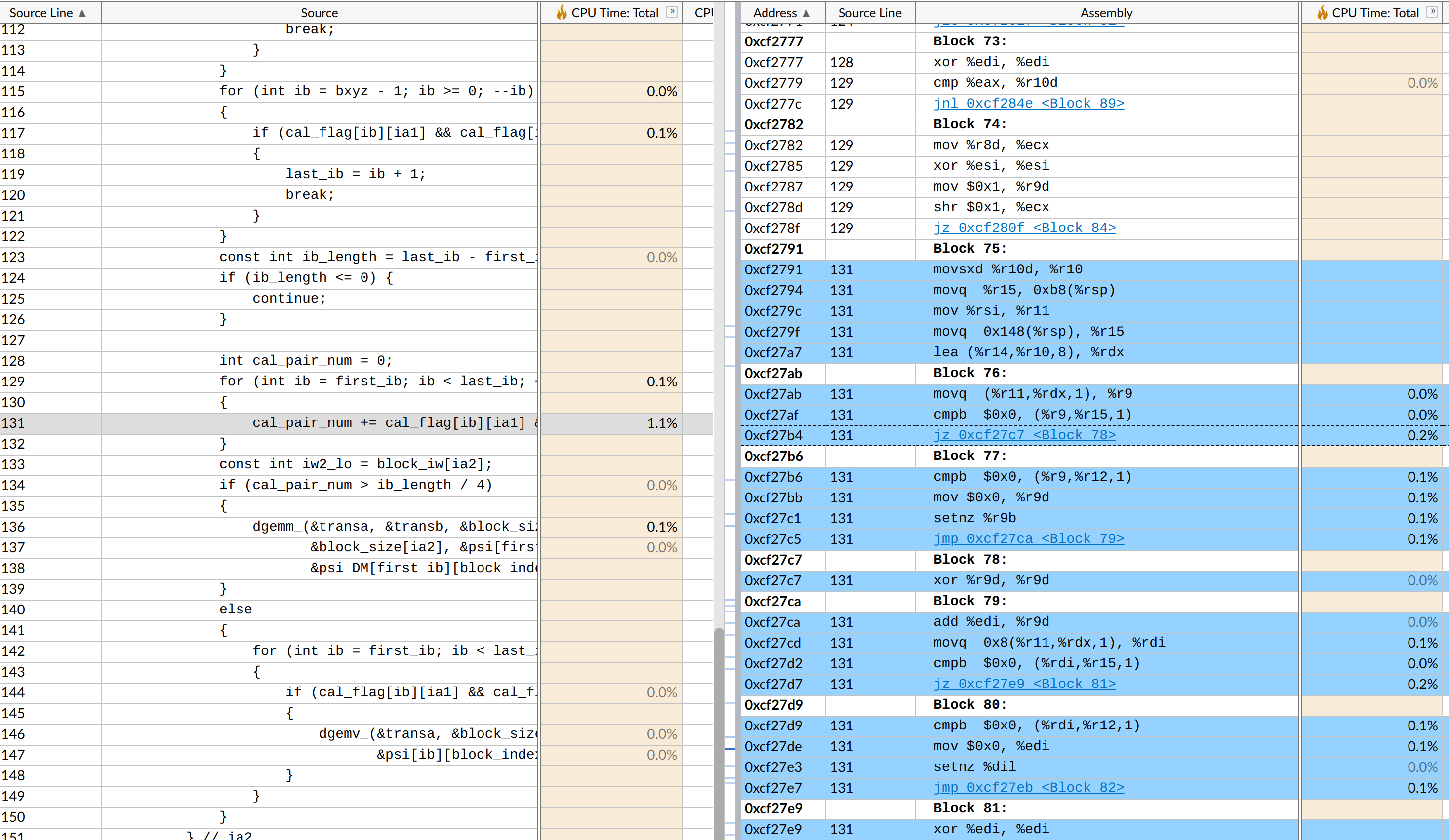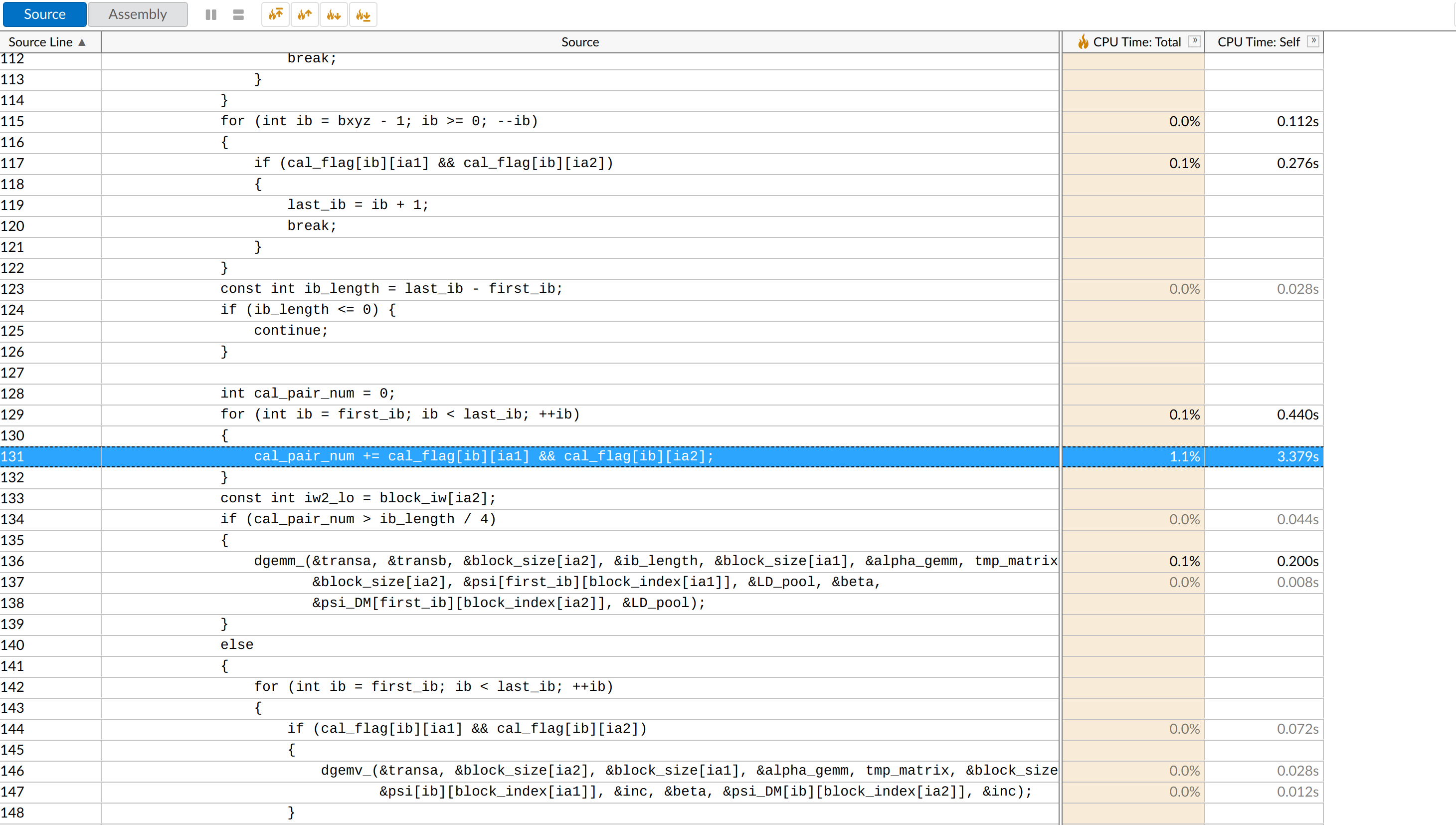 第二是双击 Bottom-up 或者 Caller/callee 列出的函数,可以看到函数每行源代码耗时占比: